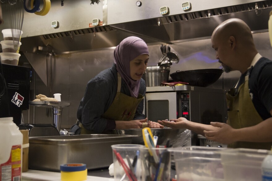 Almasri, a 30-year-old Syrian refugee, is the guest chef for the January supper club. This weekend, she’s calling the shots and coaching Smith on how to make specialties from her home country and region, like fatoush, babaghanouj and kebab, all dishes not ordinarily found on his menu.