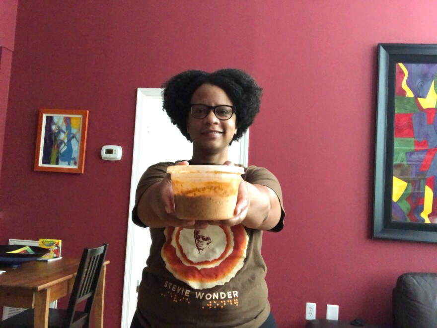 We asked NPR readers to share the items they can't live without in the pandemic. From left to right: Kenji Hall with his traditional Japanese pot, Trish Kandik with her foster dog Penelope and Lauren Morton with a takeout container of Indian food.