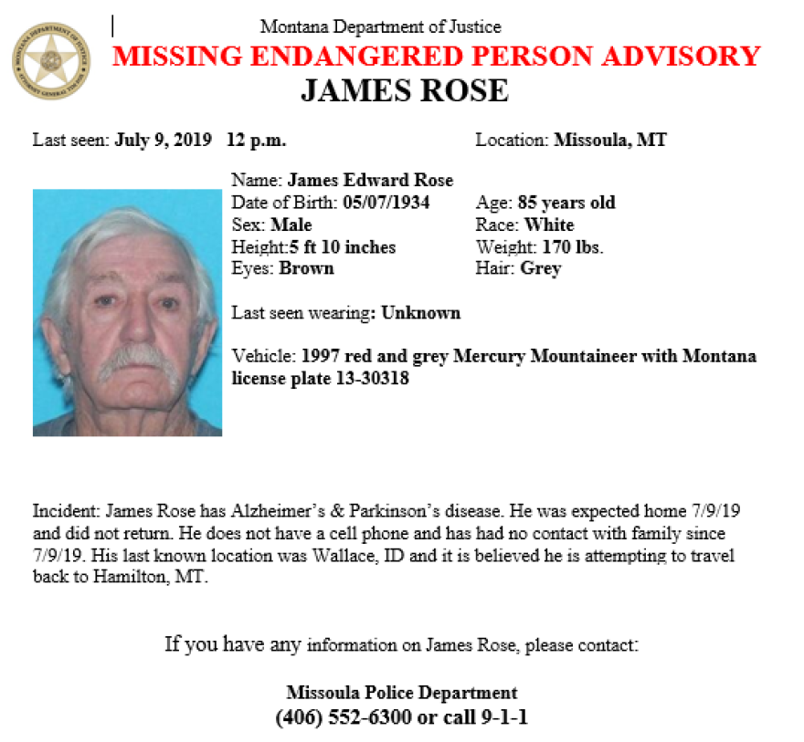Montana News Missing Missoula Man Found Safe Montana Public Radio | By Eric Whitney Published July 10, 2019 at 1:30 PM MDT Facebook Flipboard LinkedIn Email Montana Dept. of Justice "The Missing Endangered Persons Advisory for James Rose has been canceled. He has been safely located. Missoula Police Department thanks you for your assistance."